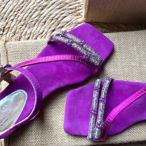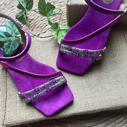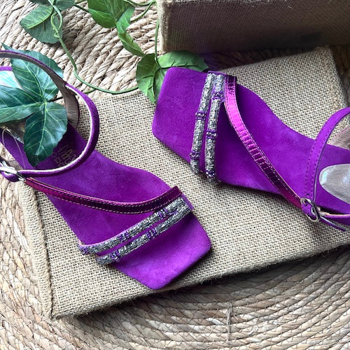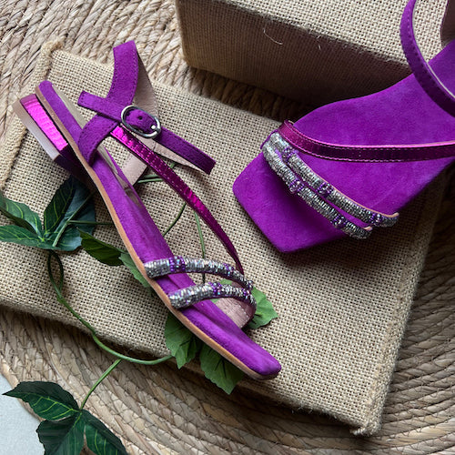 Sandalia de tacón bajo de la marca Itse. Modelo de tiras en pedrería y piel nobuk color lila. Cierre mediante tira con hebilla ajustable a la altura del tobillo. Suela de goma.