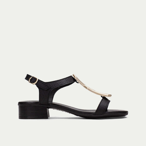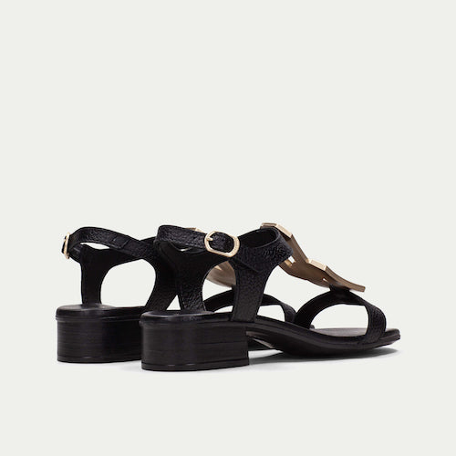 Sandalia plana de la marca Hispanitas. Fabricada en piel color negro. Adorno dorado en el empeine y cierre de hebilla al tobillo. Este modelo incorpora la tecnología TRIFLOW, amortigua cada paso aportando flexibilidad y confort en la pisada, gracias a su triple almohadillado.