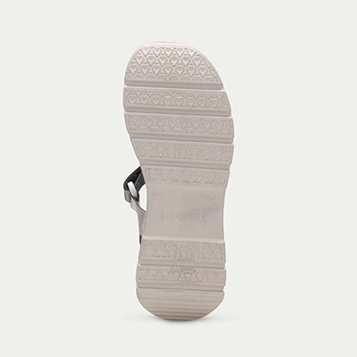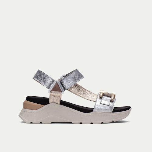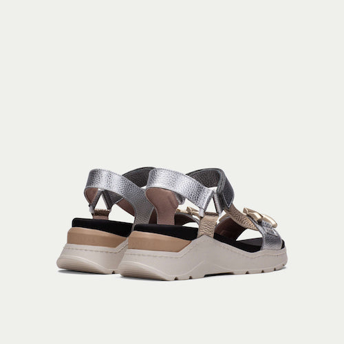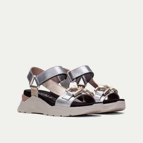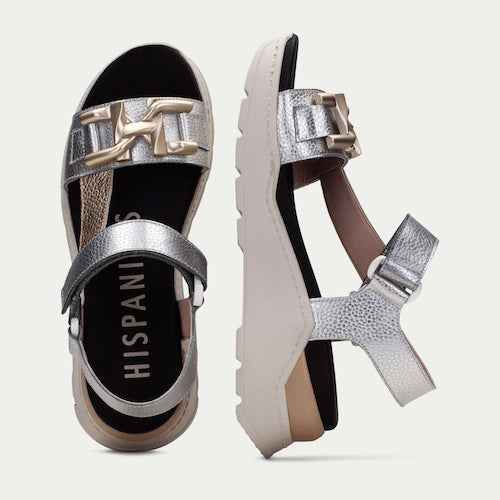 Sandalia casual de con suela volumen de la marca Hispanitas. Fabricada en piel en colores metalizados. Adorno de cadena en oro mate en la parte delantera. Este zapato incorpora la tecnología TRIFLOW, amortigua cada paso aportando flexibilidad y confort en la pisada, gracias a su triple almohadillado.