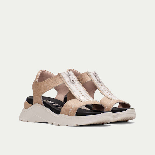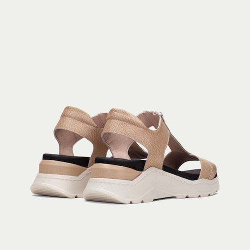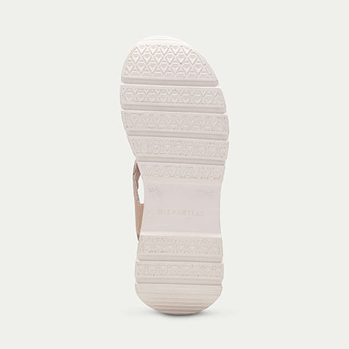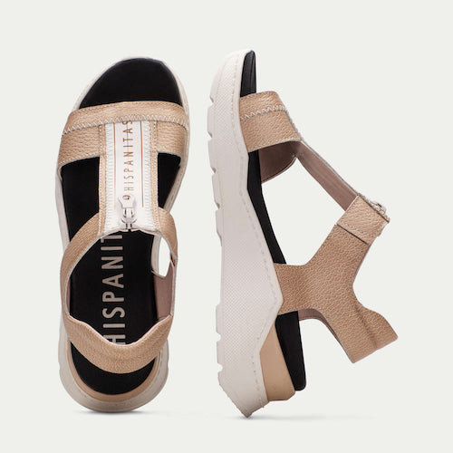 Sandalia sport con suela volumen de la marca Hispanitas. Fabricada en piel color camel. Cierre de cremallera en el empeine con el nombre de la marca. Este modelo incorpora la tecnología TRIFLOW, que amortigua cada paso aportando flexibilidad y confort en la pisada, gracias a su triple almohadillado.
