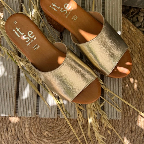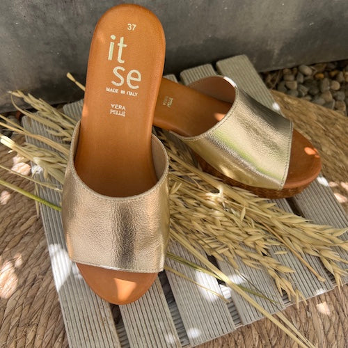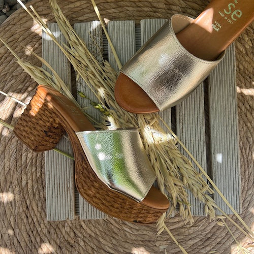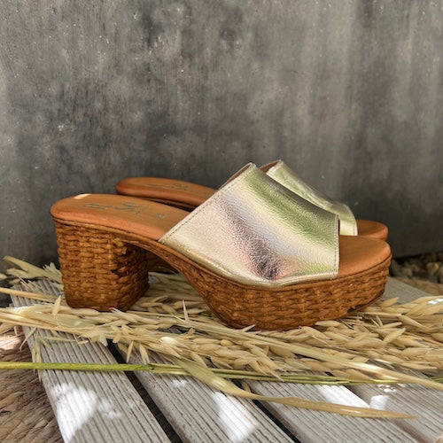 Zueco con plataforma y tacón de la marca Itse. Fabricado en piel color platino metalizado. Plataforma y tacón efecto trenzado. Máxima comodidad gracias a su plantilla acolchada.