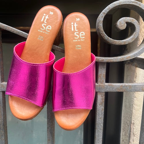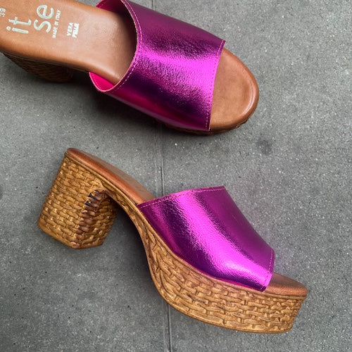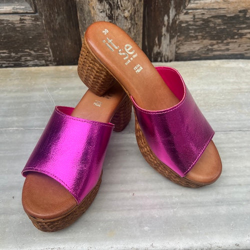Zueco con plataforma y tacón de la marca Itse. Fabricado en piel color fucsia metalizado. Plataforma y tacón efecto trenzado. Máxima comodidad gracias a su plantilla acolchada.