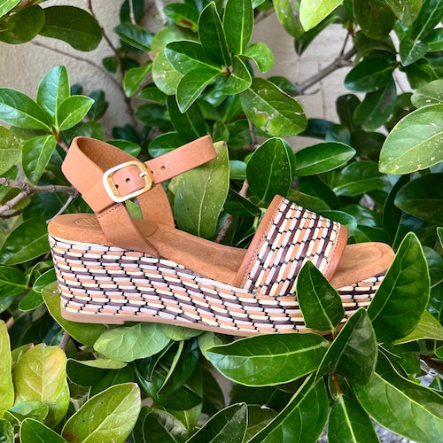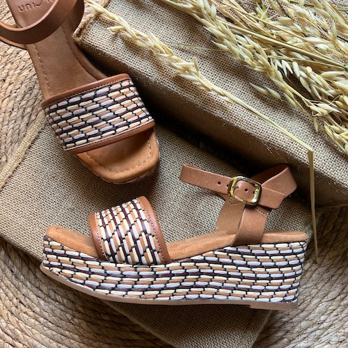 Sandalia con plataforma y cuña de la marca Unisa. Modelo en piel cuero con estampado lineal combinando en tonalidades tierra. Tira ancha en su parte frontal. Cierre mediante tira con hebilla ajustable a la altura del tobillo.