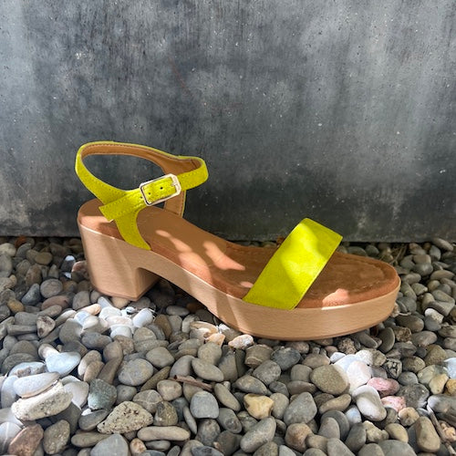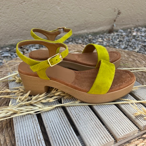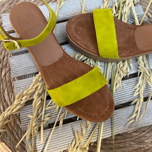 Sandalia con plataforma y tacón medio de la marca Unisa. Fabricada en ante color pistacho. Cierre mediante hebilla ajustable a la altura del tobillo. Modelo de punta redonda. Piso efecto madera muy ligero y suela de goma antideslizante.
