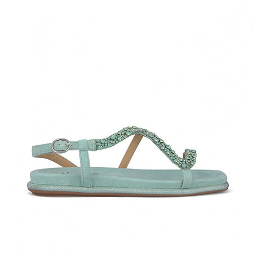 Sandalia plana de la marca Alma en Pena. Fabricada en piel nobuk en color aguamarina. Modelo de punta cuadrada con tira de pedrería al tono. Cierre con hebilla ajustable a la altura del tobillo. Planta acolchada. Suela de goma.