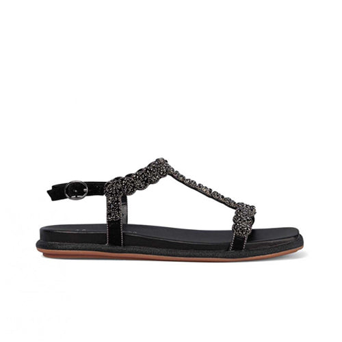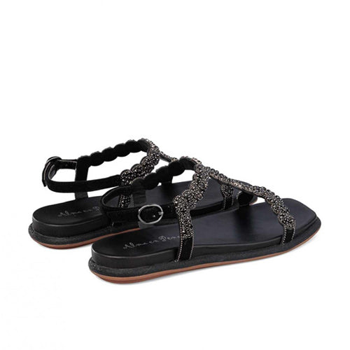 Sandalia plana de la marca Alma en Pena. Fabricada en piel color negro. Modelo de punta cuadrada con pedrería. Cierre con hebilla en tobillo y suela acolchada.