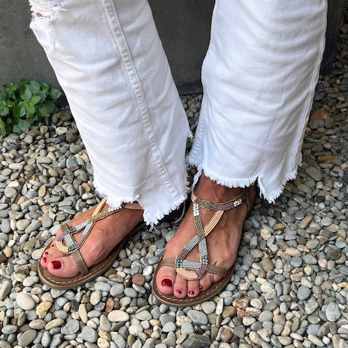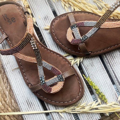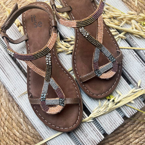 Sandalia fantasía de la marca Itse. Modelo de punta redonda con tiras entrelazadas en tonalidades nude y tierra. Tiras con pedrería. Plantilla de piel acolchada muy confortable. Suela de goma.