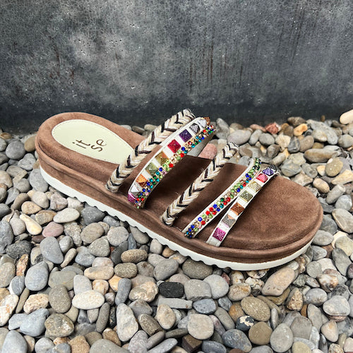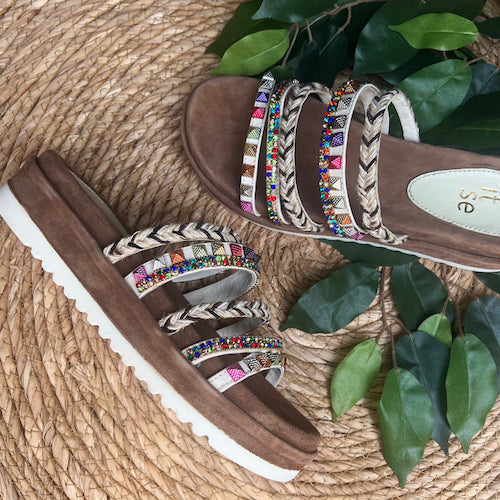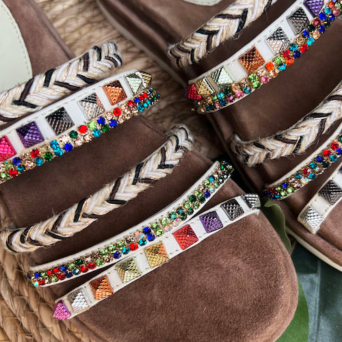 Sandalia fantasía de la marca Itse. Modelo tipo pala de punta redonda. Fabricada en piel nobuk color marrón con tiras multicolor en el empeine. Detalle de tachas y pedrería. Plantilla acolchada muy confortable. Suela de goma.