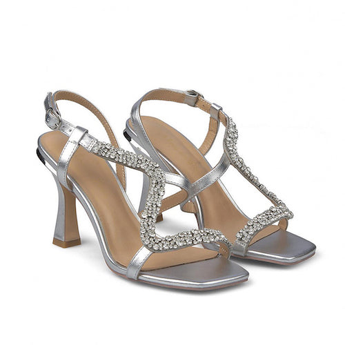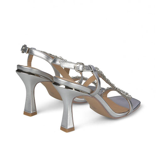 Sandalia de tacón alto de la marca Alma en Pena. Fabricada en peil color plata. Tira de pedrería a lo largo del empeine. Cierre con hebilla ajustable a la altura del tobillo. Plantilla acolchada de piel.
