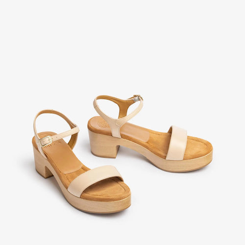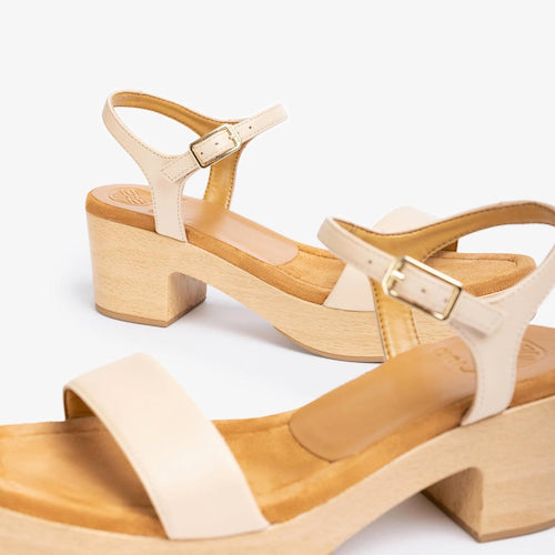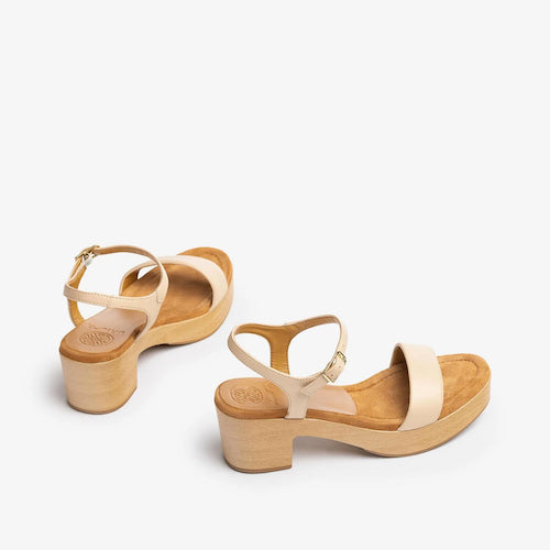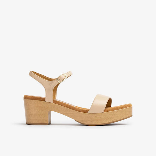 Sandalia con plataforma y tacón medio de la marca Unisa. Fabricada en piel color camel. Cierre mediante hebilla ajustable a la altura del tobillo. Modelo de punta redonda. Piso efecto madera muy ligero y suela de goma antideslizante.
