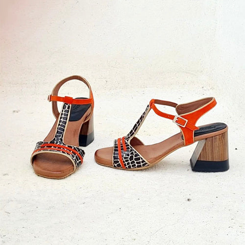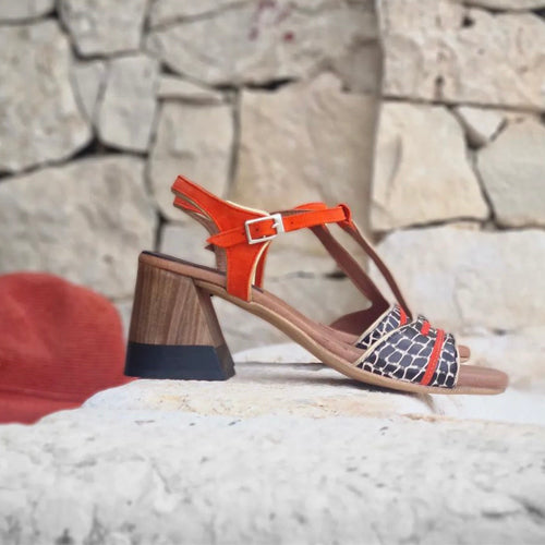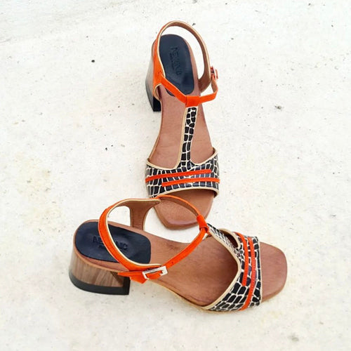 Sandalia de tacón medio de la marca Nemonic. Modelo de línea vintage. Fabricada en piel color negro y beige, combinada con detalles en color naranja. Tacón forrado en color madera y negro. Cierre mediante tira con hebilla ajustable a la altura del tobillo. Un diseño de aire retro muy femenino.