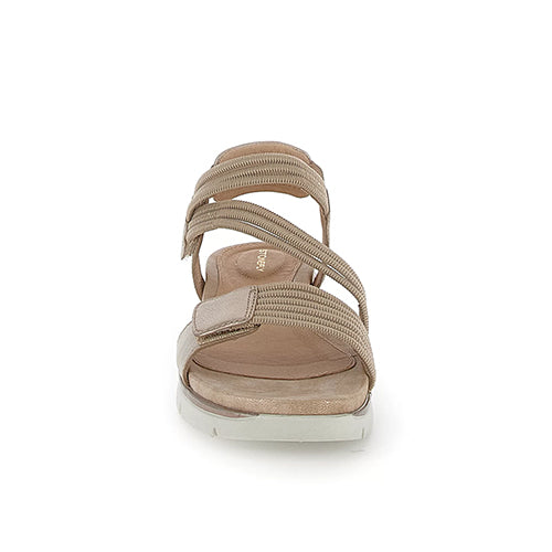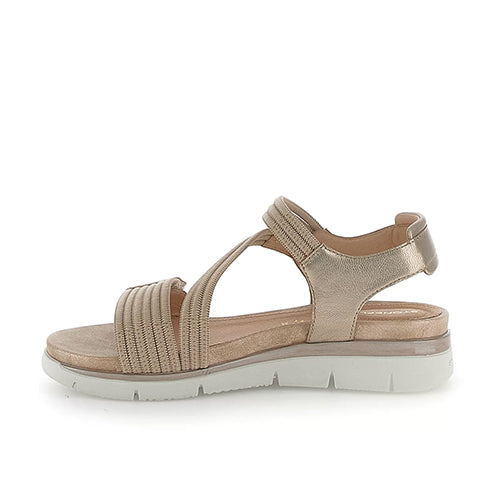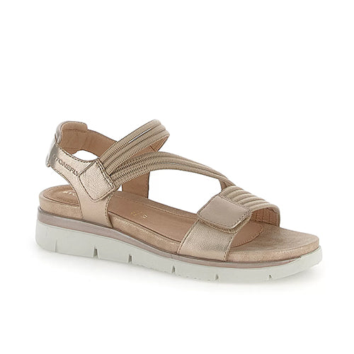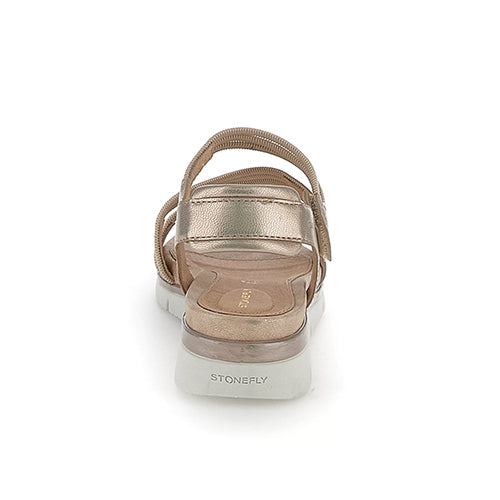Sandalia plana de la marca Stonefly. Diseño con tiras elásticas fabricado en combinación de piel y textil en color nude. Modelo con tecnología Blusoft® que ofrece pasos suaves y ligeros, con un nivel inigualable de comodidad y amortiguación. Cierre mediante velcros en la tira delantera y superior. Suela EVA.