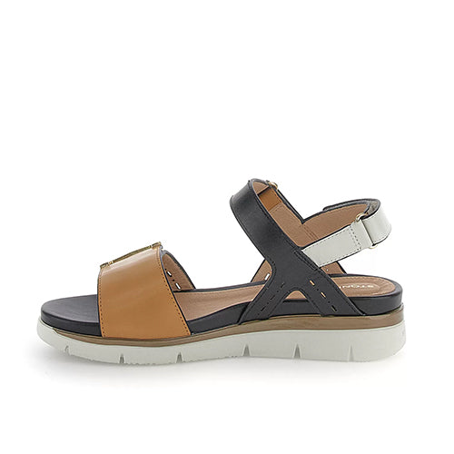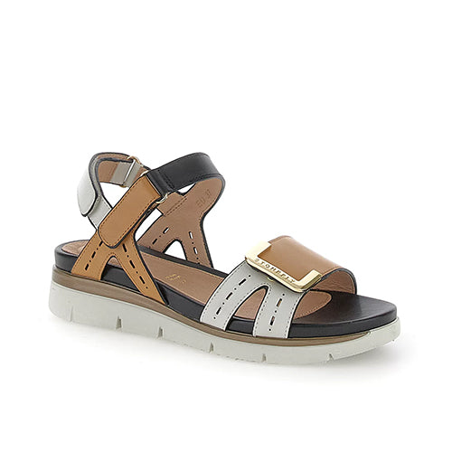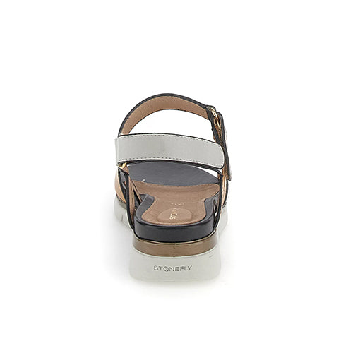 Sandalia plana de la marca Stonefly. Fabricada en piel combina colores cálidos en blanco, azul y cuero. Detalle de hebilla dorada en la tira delantera con detalle de marca. Tira superior y trasera ajustable mediante velcros. Este modelo utiliza la tecnología Blusoft® que ofrece pasos suaves y ligeros, con un nivel inigualable de comodidad y amortiguación. Suela EVA.