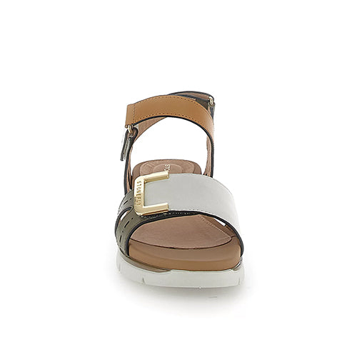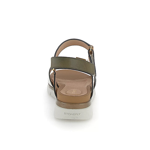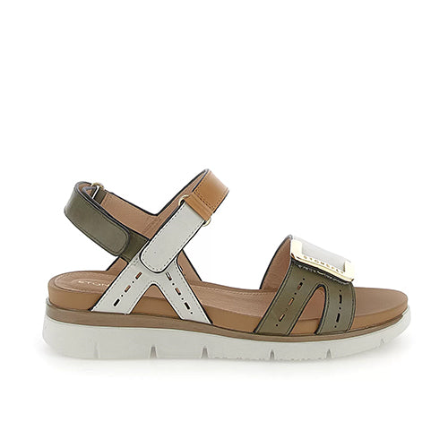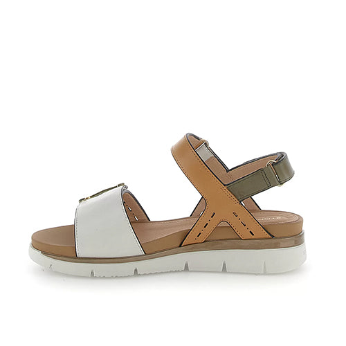 Sandalia plana de la marca Stonefly. Fabricada en piel combina colores cálidos en blanco, kaki y cuero. Detalle de hebilla dorada en la tira delantera con detalle de marca. Tira superior y trasera ajustable mediante velcros. Este modelo utiliza la tecnología Blusoft® que ofrece pasos suaves y ligeros, con un nivel inigualable de comodidad y amortiguación. Suela EVA.