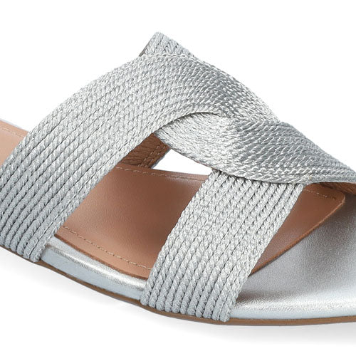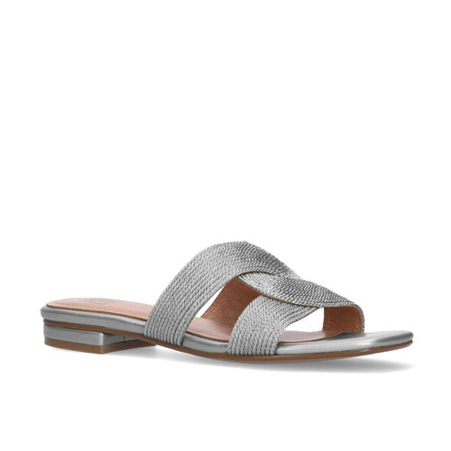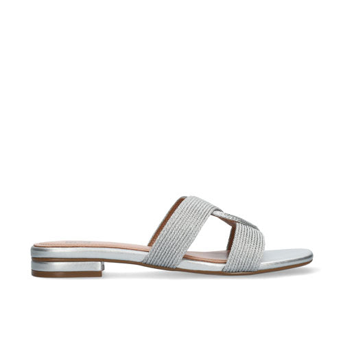 Sandalia plana estilo pala de la marca Bibi Lou. Empeine efecto rafia en color plata. Modelo de punta semi-cuadrada con tacón tipo bloque forrado al tono.