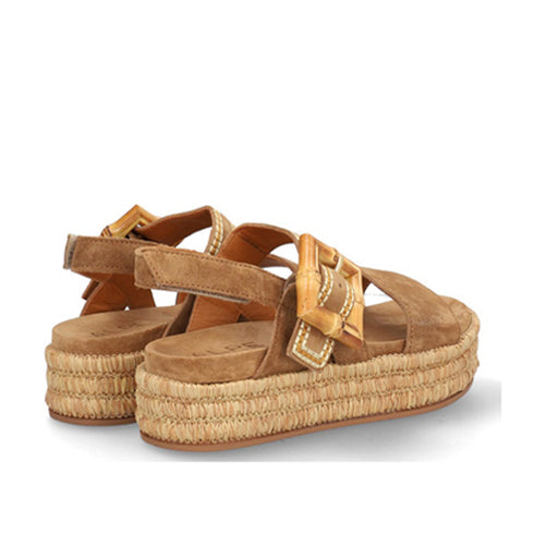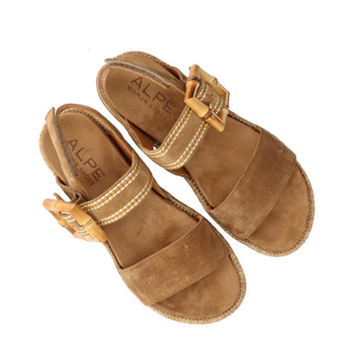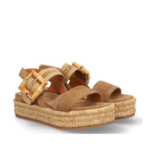 Sandalia con plataforma de la marca Alpe. Fabricada en piel nobuk color cuero. Modelo de doble tira con original detalle de hebilla cuadrada tipo bambú. Plataforma en material natural. Tira superior con detalle de repunte a contraste. Cierre mediante tira con hebilla a la altura del tobillo. Puntera redonda y suela antideslizante.