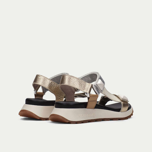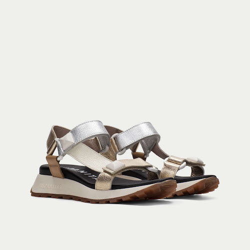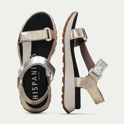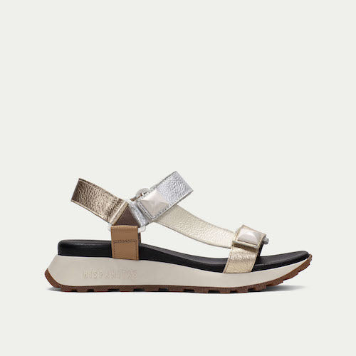 Sandalia casual de la marca Hispanitas. Fabricada en piel en colores metalizados. Suela volumen. Diseño con detalles de tachuelas y cierre de velcro, lo que permite un ajuste perfecto al pie. Este modelo incorpora la tecnología TRIFLOW, que amortigua cada paso aportando flexibilidad y confort en la pisada, gracias a su triple almohadillado.