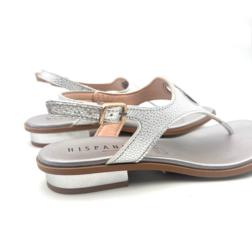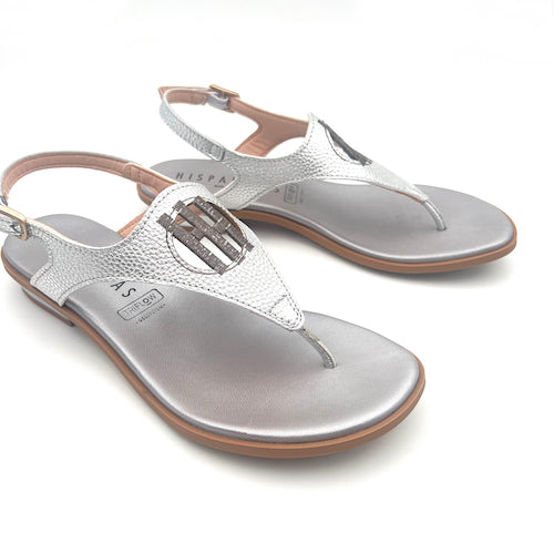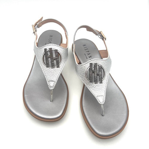 Sandalia plana de entrededo de la marca Hispanitas. Fabricada en piel color plata. Diseño minimalista con detalle de logo troquelado en el empeine. Cierre mediante tira con hebilla ajustable a la altura del tobillo. Este modelo incorpora la tecnología TRIFLOW, que amortigua cada paso aportando flexibilidad y confort en la pisada, gracias a su triple almohadillado.