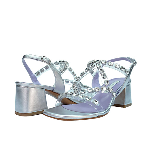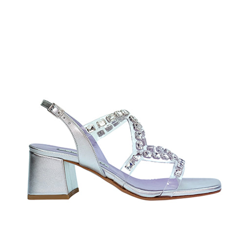Sandalia de tacón de la marca Albano. Original modelo de tiras trasparentes y piezas de strass en el empeine. Diseño en color plata con puntera semicuadrada. Tacón tipo bloque forrado al tono. Plantilla de piel. Suela sintética.