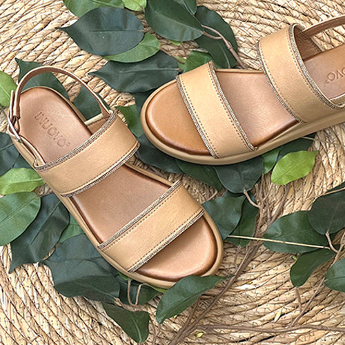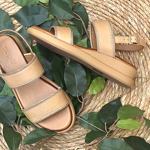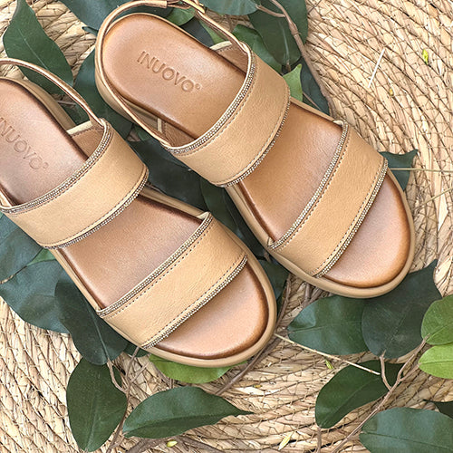Sandalia con cuña de la marca INUOVO. Fabricada en piel color cuero. Modelo de doble tira con detalles de strass en color dorado. Ciere mediante tira con hebilla ajustable. Interior del piel y suela de goma.