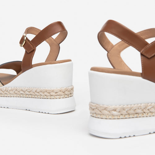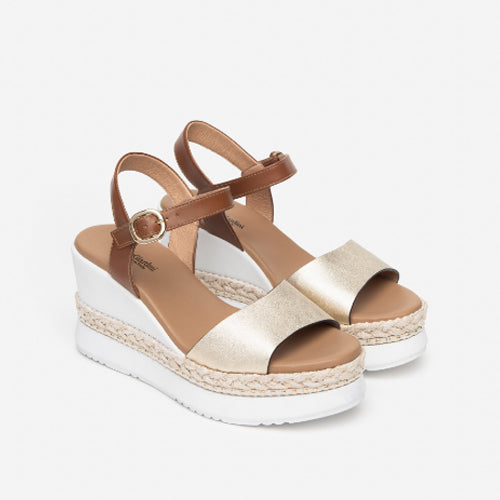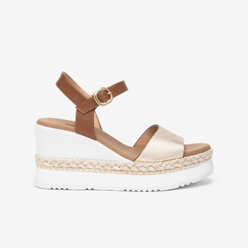 Sandalia casual con plataforma y cuña de la marca Nero Giardini. Fabricada en piel color platino. Cierre mediante tira en cuero con hebilla ajustable a la altura del tobillo. Diseño de tira frontal en color platino. Piso en color blanco, que incluye cerco en yute con detalle de pequeñas tachas en color dorado. Modelo de punta redonda. Suela de goma.
