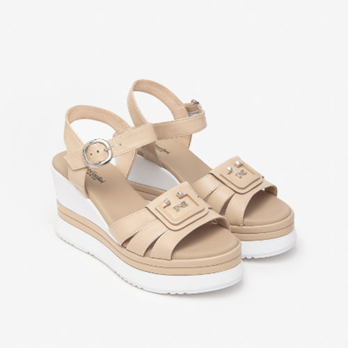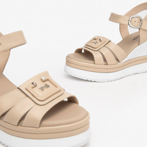 Sandalia casual con plataforma y cuña de la marca Nero Giardini. Fabricada en piel color camel. Cierre mediante tira con hebilla ajustable a la altura del tobillo. Diseño de triple tira con detalle de marca en la parte frontal. Cuña combinada en bicolor, colores blanco y camel. Modelo de punta redonda. Suela de goma.