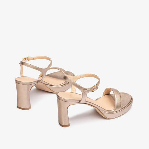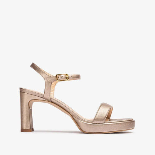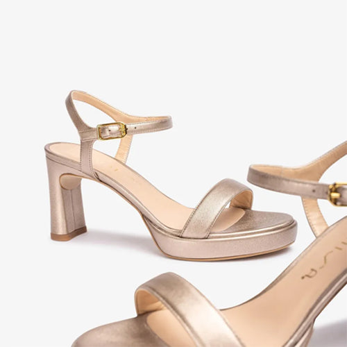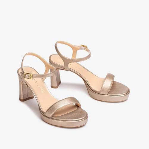Sandalia de plataforma y tacón de la marca Unisa. Fabricada en piel metalizada color bronce. Modelo de punta redonda con tira delantera. Cierre mediante tira con hebilla ajustable. Tacón forrado en piel al tono. Suela de goma ligera y antideslizante.
