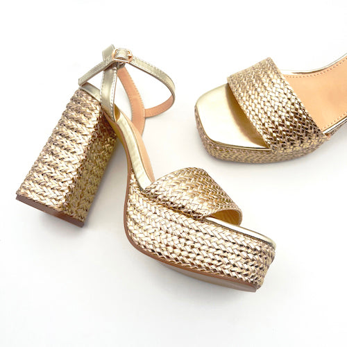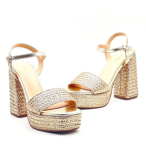 Sandalia de plataforma y tacón alto de la marca Altrimenti. Fabricada en material sintético efecto rafia en color oro. Modelo de tira ancha en la parte delantera. Cierre mediante hebilla ajustable a la altura del tobillo.