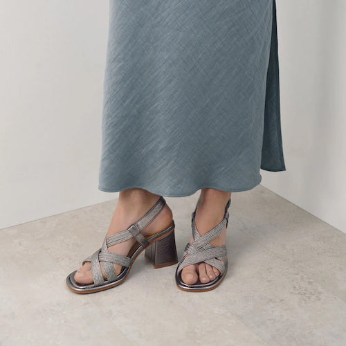Sandalia de tacón de la marca Regarde Le Ciel. Fabricada en piel en color estaño. Modelo de tiras cruzadas en el empeine efecto rafia. Cierre mediante tira con hebilla ajustable a la altura del tobillo. Tacón bloque forrada al tono.