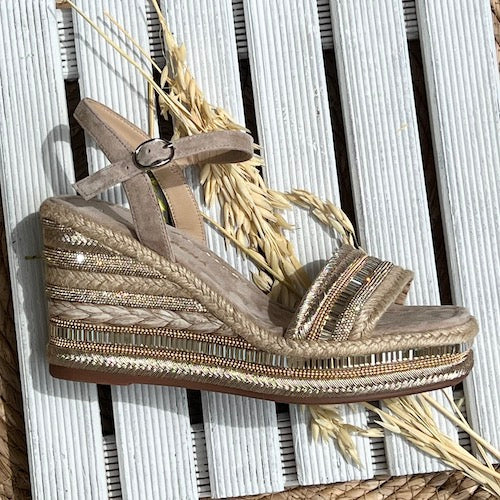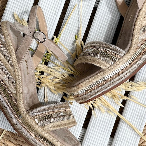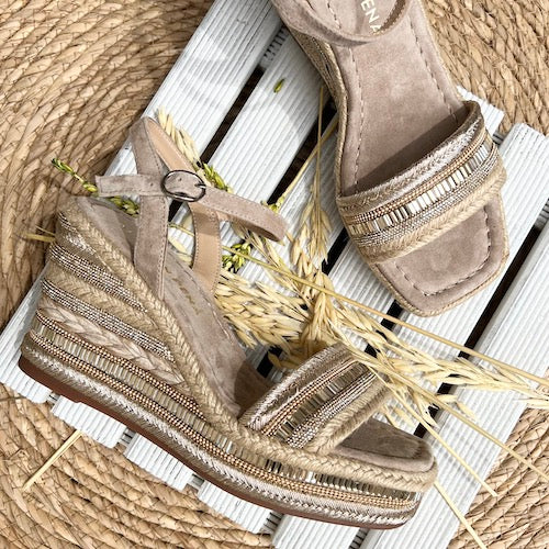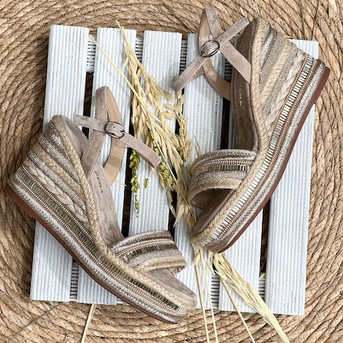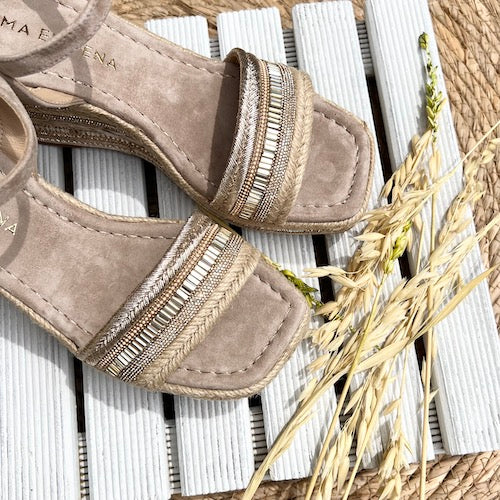 Sandalia de plataforma y cuña de la marca Alma en Pena. Confeccionada en piel color taupe. Totalmente forrada con detalles de trenzado y pedrería. Puntera cuadrada. Cierre mediante tira con hebilla ajustable a la altura del tobillo. Plantilla acolchada y suela de goma.