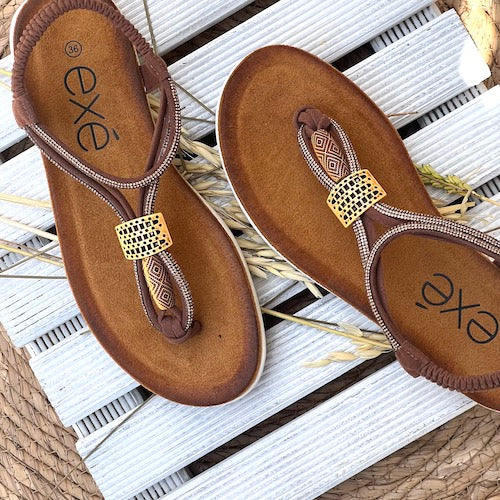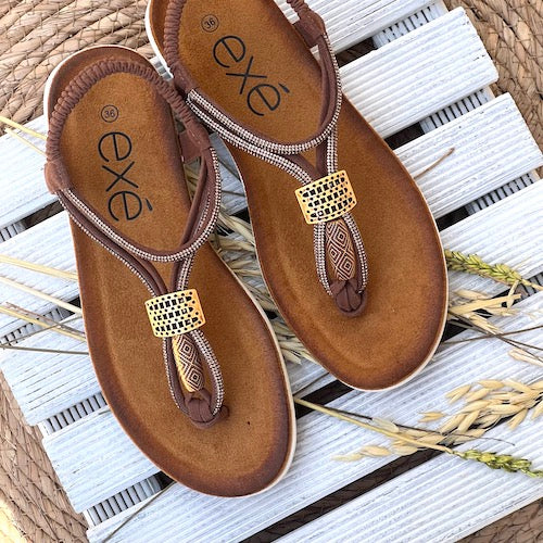 Sandalia plana de la marca Exe en color cuero. Tira de entrededo combinando piezas efecto natural y strass. Plantilla de antelina para una pisada suave y confortable. Goma elástica en la parte posterior del modelo para un ajuste perfecto.