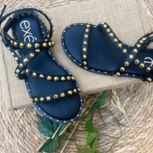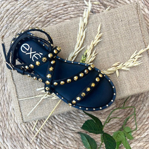 Sandalia plana de la marca EXE. Fabricada en material sintético color negro. Modelo de tiras con detalle de tachuelas doradas. Cierre mediante tira con hebilla ajustable a la altura del tobillo. Suela de goma.