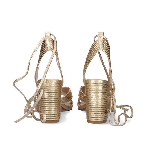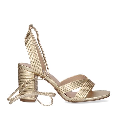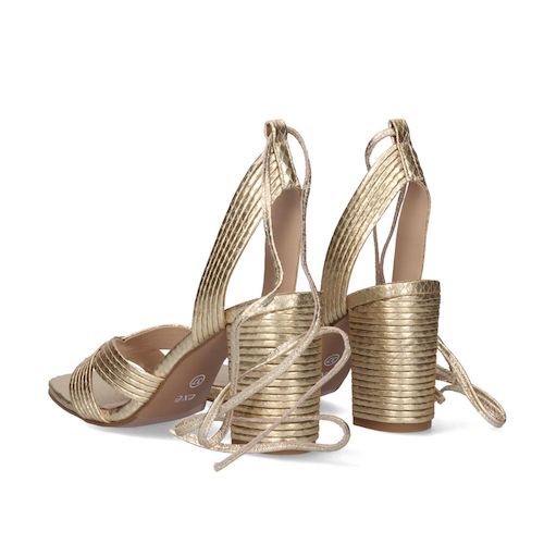 Sandalia con tacón de la marca EXE. Corte y suela en material sintético. Modelo efecto snake gold. Plantilla de piel. Cierre mediante tiras atadas a lo largo del tobillo.
