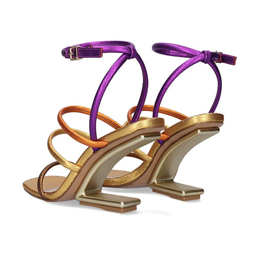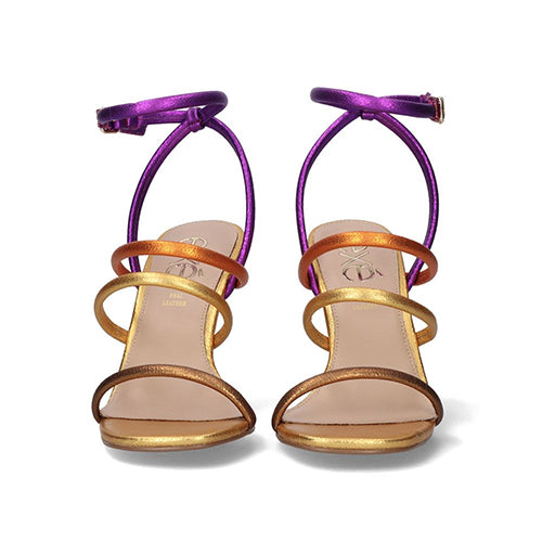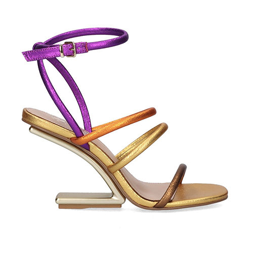 Sandalia con tacón de la marca EXE. Modelo de tiras en multicolor efecto metalizado. Original tacón metálico gold. Cierre mediante tira con hebilla a la altura del tobillo. Corte y suela de material sintético. Plantilla de piel.