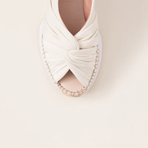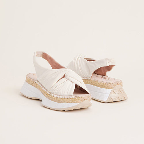 Sandalia casual de la marca Gaimo. Modelo con tubular en tejido nylon acolchado en color beige hielo y trasera destalonada con elástico. Forro y plantillas acolchadas de piel y piso de yute ecológico con base de goma ultraligera. Diseñadas y fabricadas artesanalmente en España. Un diseño deportivo de estilo desenfadado pero llamativo y sofisticado, apto para cualquier look de verano.