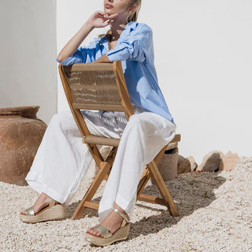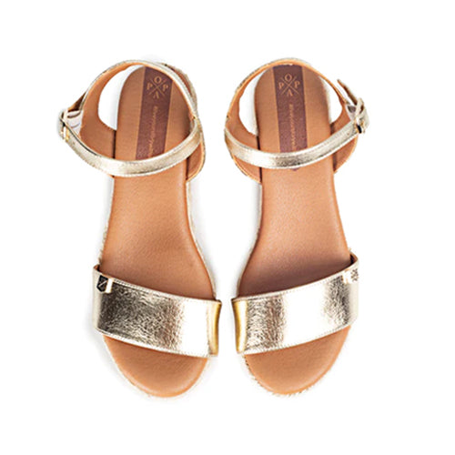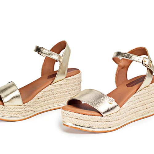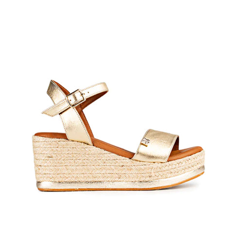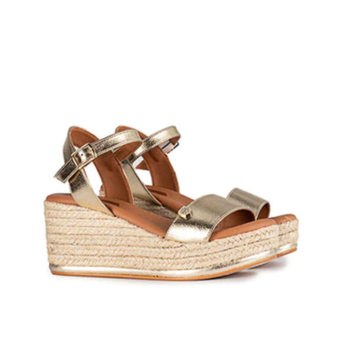 Sandalia de yute con plataforma y cuña de la marca Popa. Fabricada en piel color oro. Modelo de punta redonda. Cierre mediante tira con hebilla ajustable a la altura del tobillo. Detalle de filete en color oro en la base. Planta en piel vegana acolchada de gran comodidad.