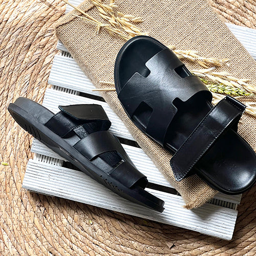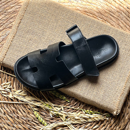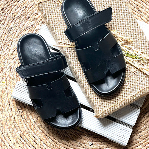 Sandalia plana de la marca itse. Fabricada en piel color negro. Modelo de tira amplia cubriendo el empeine y tira estrecha superior. Cierre mediante velcro ajustable. Suela de goma.