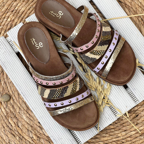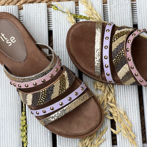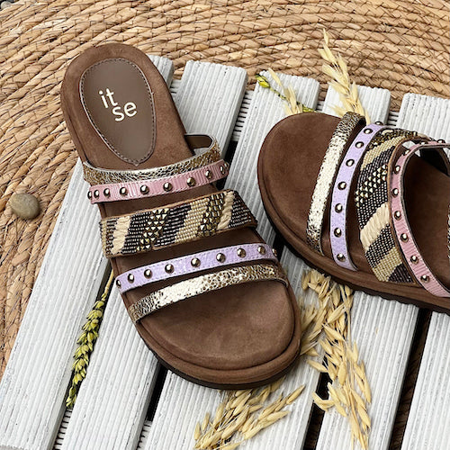 Sandalia de tiras multicolor de la marca itse. Modelo de suela volumen fabricada en piel nobuk cuero. Diseño multi tiras que cubre el empeine con tonalidades lila, nude, beige y metalizado dorado. Detalle de tachas. Plantilla de piel y suela de goma.