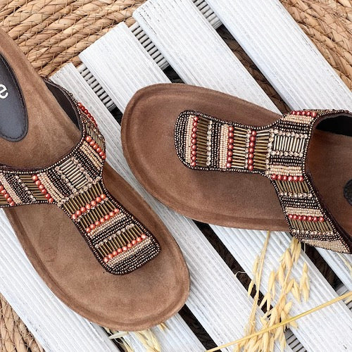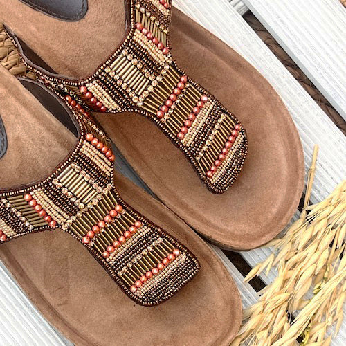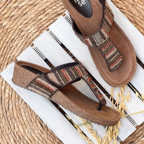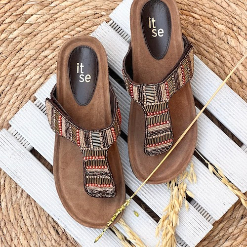 Sandalia de entrededo de la marca itse. Modelo con cuña, tipo bio, con piso en material corcho. Diseño multicolor en tonalidades tierra, que combina diferentes adornos. Cierre mediante velcro ajustable en el lateral. Plantilla de piel y suela de goma.