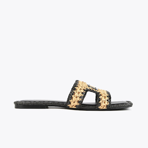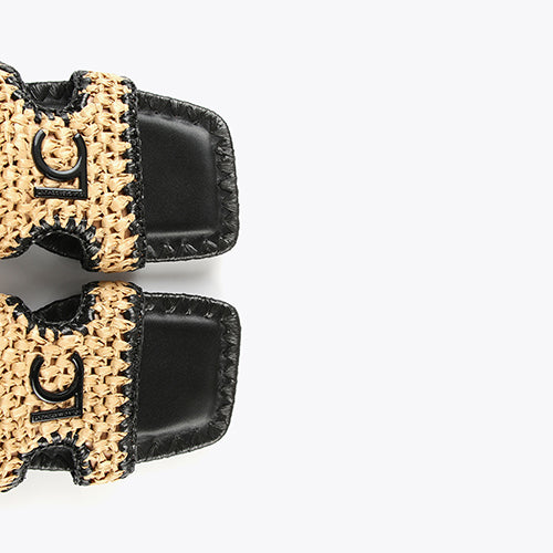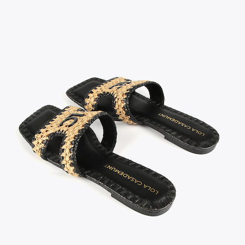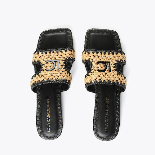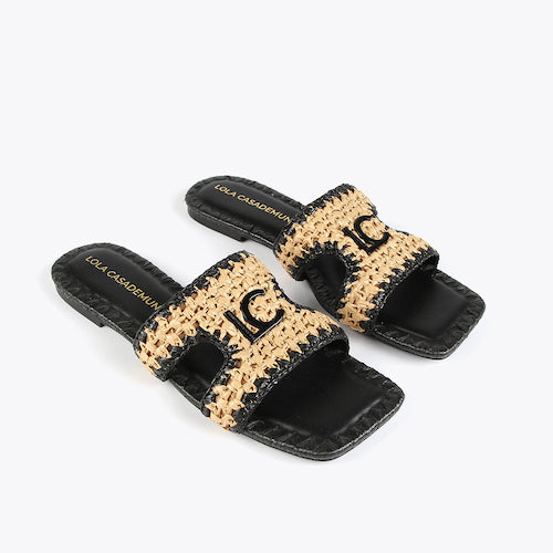 Sandalia tipo pala de la marca Lola Casademunt. Fabricada en material efecto piel y rafia. Plantilla logotipada. Detalle de logotipo lacado en la parte frontal. Modelo de puntera cuadrada. Suela de goma.