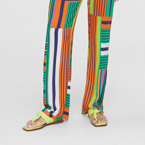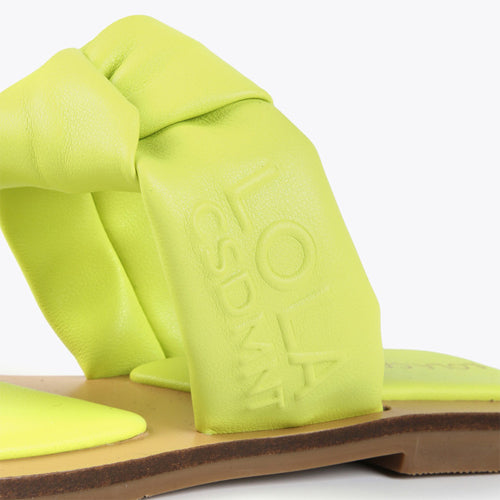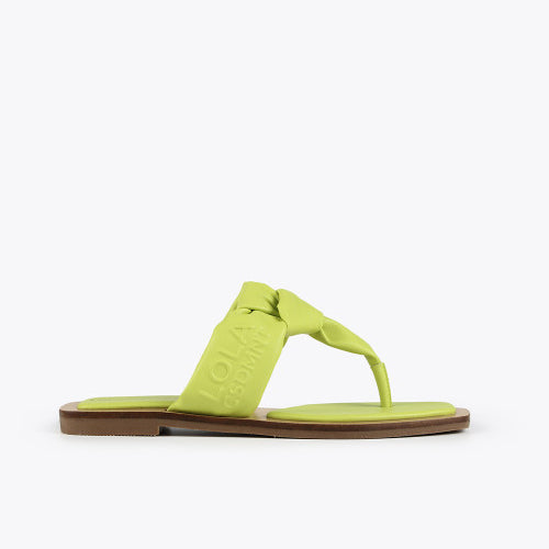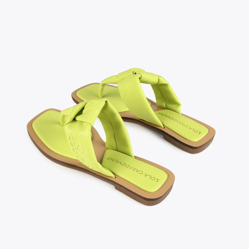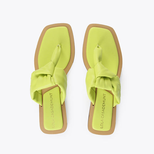 Sandalia plana estilo pala de la marca Lola Casademunt. Fabricada en material sintético efecto piel en color pistacho. Modelo de entrededo con original detalle de nudo en el empeine. Detalle de logo en relieve en el lateral. Suela de goma.