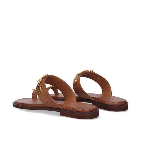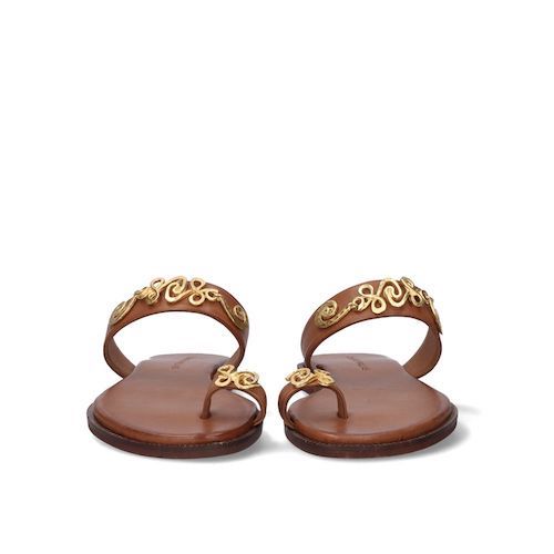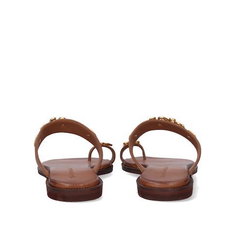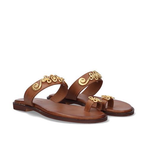 Sandalia plana de la marca Tsakiris Mallas en color cuero. Corte y plantilla de piel y suela en material sintético. Cuenta con dos adornos dorados en sus tiras.
