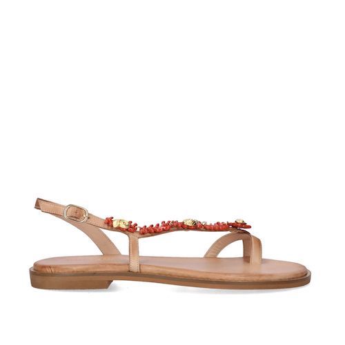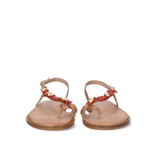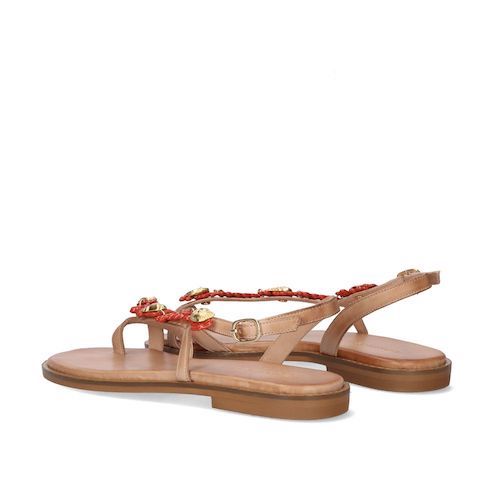 Sandalia plana de la marca Tsakiris Mallas en color camel. Corte y plantilla de piel y suela en material sintético. Cuenta con adornos estilo natural, en tonos dorados y rojizos, situados en la tira central. Cierre mediante tira con hebilla a la altura del tobillo.