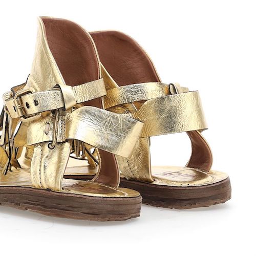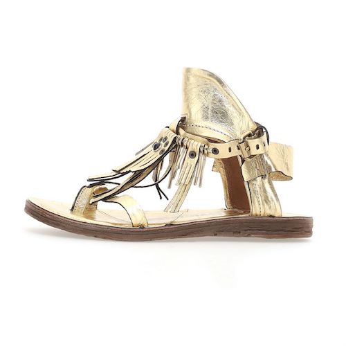 Sandalia plana de la marca AS98. Fabricada en piel color platino. Original modelo estilo rockero con detalle de flecos en el empeine y tachuelas. Suela acolchada y suave que garantiza una gran comodidad sin renunciar al estilo característico de la marca. Cierre mediante tira con hebilla ajustable a la altura del tobillo. Suela de goma.