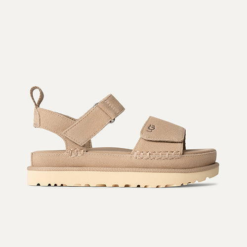 Sandalia de doble tira de la marca UGG®. Modelo Goldenstar. Fabricadas en ante color camel. Incorpora una plantilla de espuma ultraacolchada de gran sujeción, además de una suela ligera que facilita llevarlas todo el día. Incluyen dos juegos de correas ajustables mediante velcros.