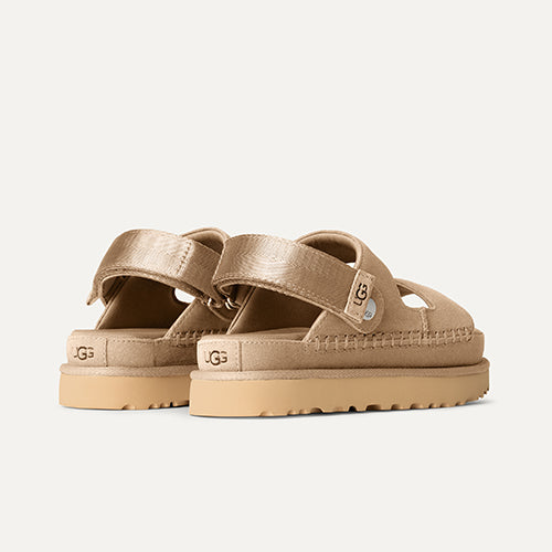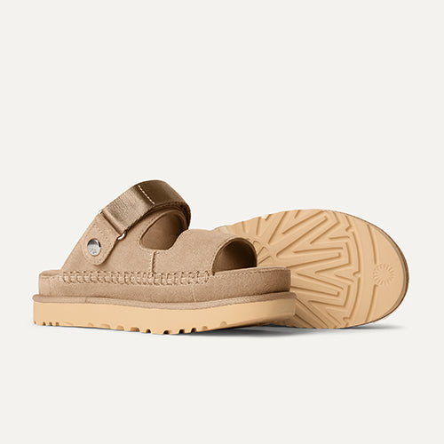 Sandalia de doble tira de la marca UGG®. Modelo Goldenstar Glide convertibles. Fabricadas en ante color camel. Están diseñadas con una tira ajustable en el talón que se puede abatir hacia delante para que puedas ponértelas como chancla. La plantilla contorneada está forrada con material suave y reciclado sometido a un tratamiento antiolores para que mantenga el frescor durante todo el día. Empeine de ante y suela de EVA de caña de azúcar renovable.