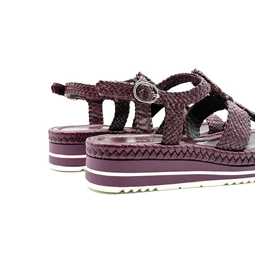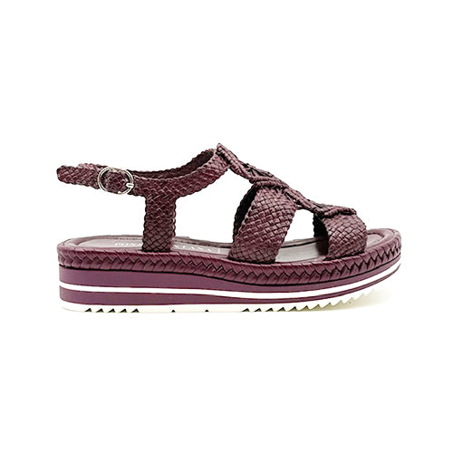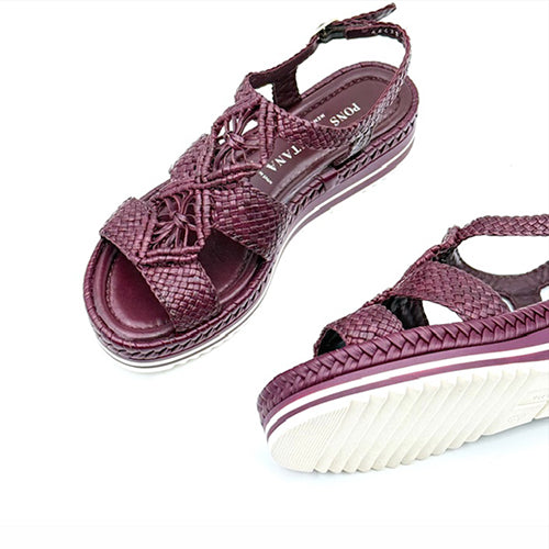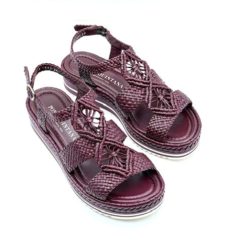 Sandalia de plataforma de la marca Pons Quintana. Fabricada a mano en piel trenzada color burdeos. Original diseño trenzado cubriendo el empeine. Cierre mediante tira con hebilla ajustable a la altura del tobillo. El detalle de cerco trenzado espiga al tono y su plataforma bicolor realzan su estilo único.