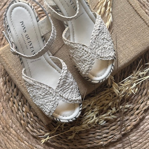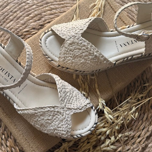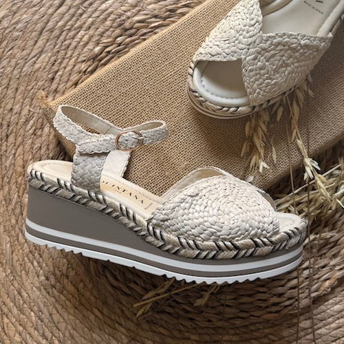 Sandalia con plataforma y cuña de la marca Pons Quintana. Confeccionada en piel trenzada a mano en color beige hielo. Cercos de yute natural. Cierre mediante tira con hebilla ajustable a la altura del tobillo. Piso bicolor a tono. Suela de goma antideslizante.
