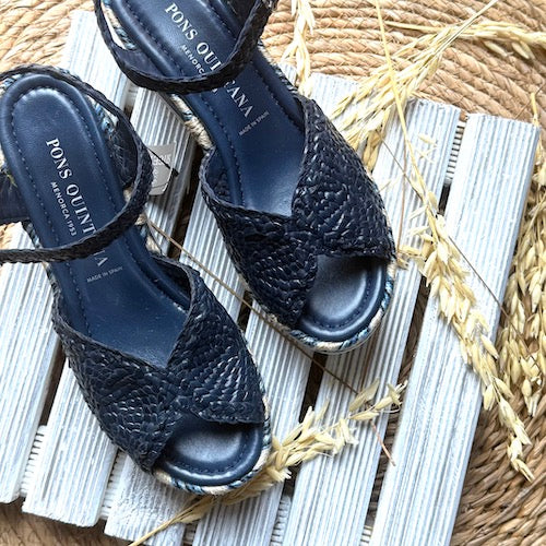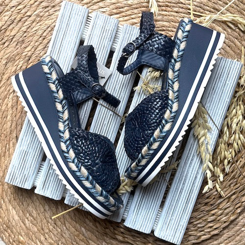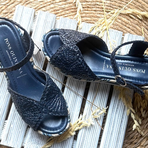 Sandalia con plataforma y cuña de la marca Pons Quintana. Confeccionada en piel trenzada a mano en color azul. Cercos de yute natural. Cierre mediante tira con hebilla ajustable a la altura del tobillo. Piso bicolor a tono. Suela de goma antideslizante.