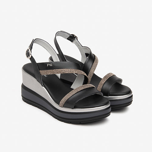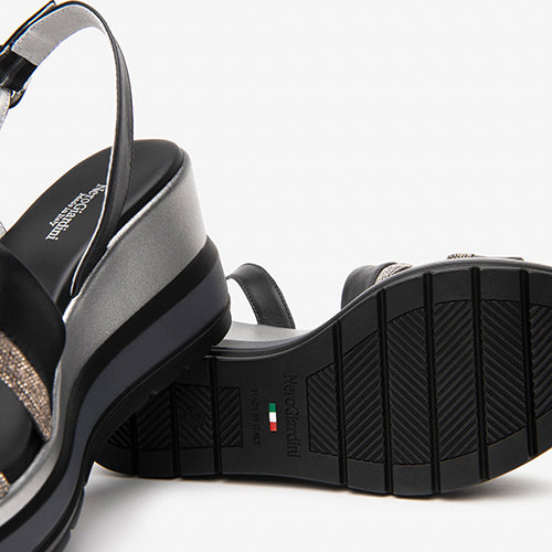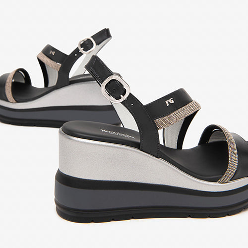 Zapato con plataforma y cuña de la marca Nero Giardini. Fabricado en piel color negro. Modelo de doble tira que combina piel lisa en color negro con strass en color plata. Cuña tricolor en colores negro, gris claro y gris oscuro. Cierre mediante tira con hebilla a la altura del tobillo. Diseño de puntera redonda. Suela de goma.